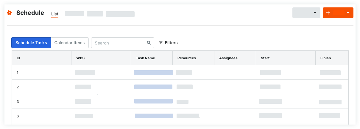 Vous verrez une liste de toutes les tâches planifiées, ainsi que leurs ressources, structure de découpage du projet, date de début et de date de fin et pourcentage d’achèvement. Vous pouvez également basculer entre l’affichage des tâches de planification et des items de calendrier en cliquant sur le bouton bascule en haut de la liste.